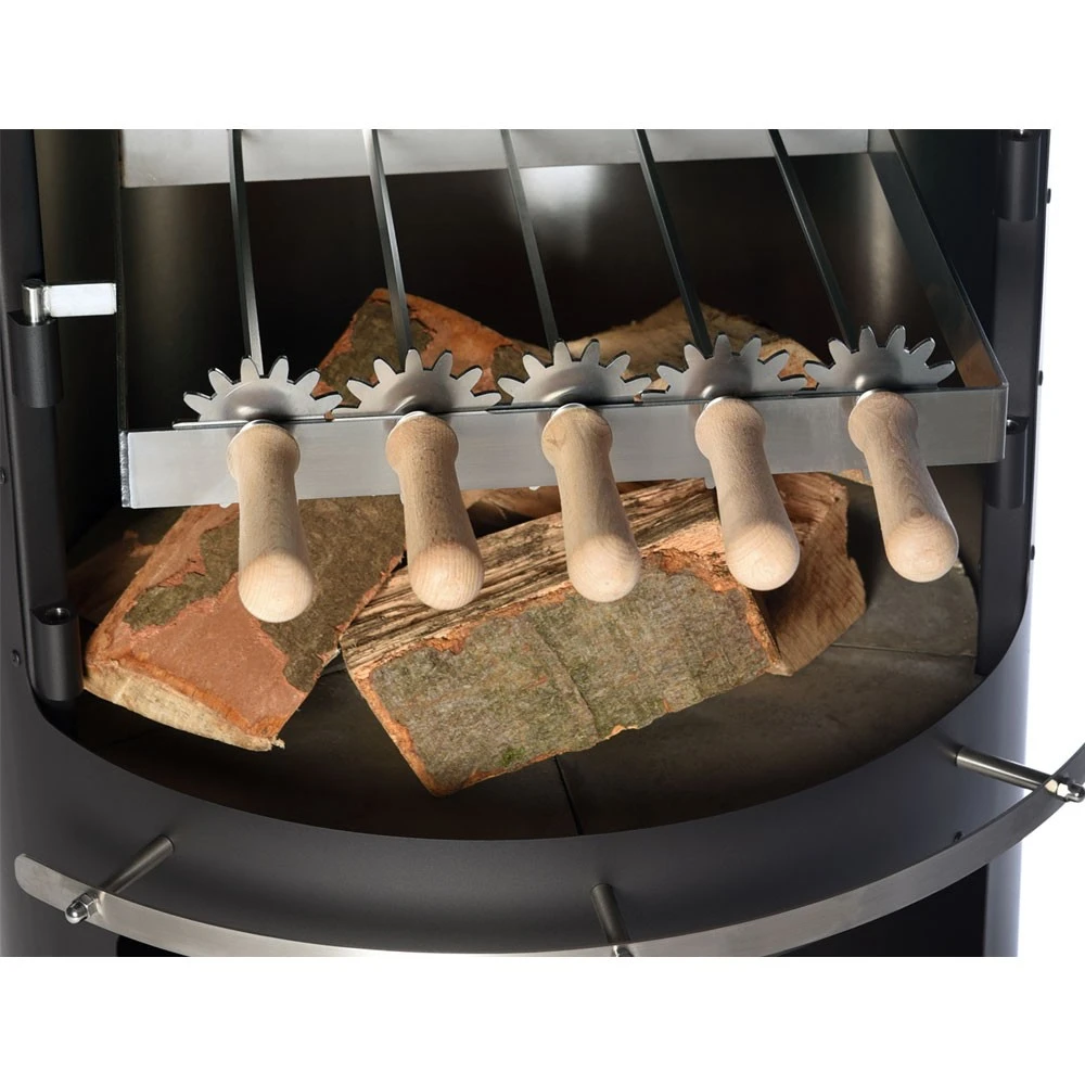 Unsere Grillspieße sind aus 100 % Edelstahl gefertigt und haben einen Zahnrad-Drehmechanismus, wodurch sich auf den Punkt genau und gleichmäßig grillen lässt. Sie brauchen nur einen Spieß zu drehen und alle anderen drehen sich mit. Die Spieße sind zudem einzeln entnehmbar um sie zu servieren oder auch einfach zu reinigen. Die Grillspieße sind passend für alle firestar Modelle und können auf 3 verschiedenen Ebenen eingehängt werden.