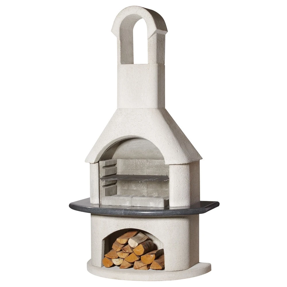 Dem Gartengrillkamin Ambiente verleiht die Verbindung der weißen Quarzstruktur-Oberfläche mit poliertem, hochwertigem schwarzem Granit eine exklusive Ausstrahlung. Die Granit-Simsplatte kann leicht gereinigt werden und behält auch nach Jahren noch ein edles Aussehen. Der Kamin besitzt wie alle BUSCHBECK Gartengrillkamine einen feuerfesten Brenneinsatz und ein großes Holzfach.