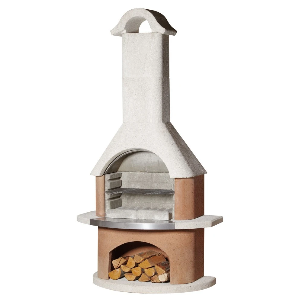 Der Grillgartenkamin Davos kommt rustikal-elegant daher. Die Feuerraum- und Holzfachverkleidung aus terracottafarbenem Strukturbeton steht in einem feinen Kontrast zu der edlen weißen Oberfläche der anderen Bauteile. Die dekorative Edelstahlblende sorgt zusätzlich für einen exklusiven Touch.