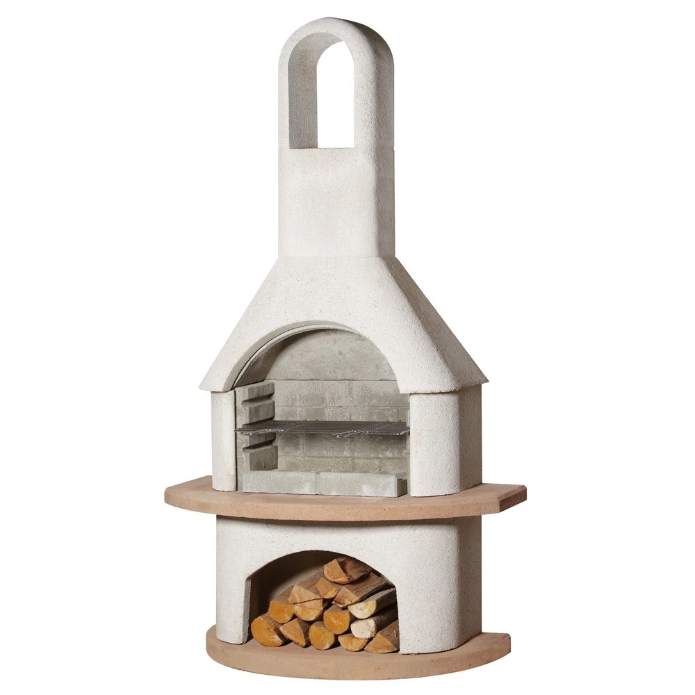 Der Gartengrillkamin Palma in weißer Quarzstruktur mit terracottafarbener Boden- und Simsplatte schafft einen besonderen Glanzpunkt in Ihrem Garten. Der großzügige Feuerraum stellt auch größere Gesellschaften zufrieden.