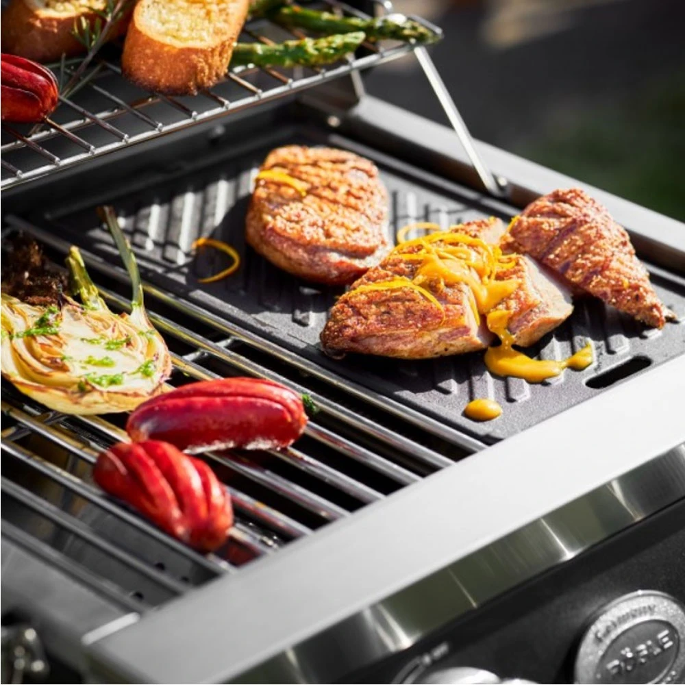 Ein großes Sichtfenster in der Grillhaube lässt das Grillgut auch bei geschlossenem Deckel nicht unbeobachtet. So kann jederzeit per Sichtprüfung entschieden werden, ob und wann Hand angelegt werden soll, ohne den Garprozess zu unterbrechen. Unnötiges Öffnen des Deckels verkürzt die Grillzeit und spart Energie. - Grillfläche